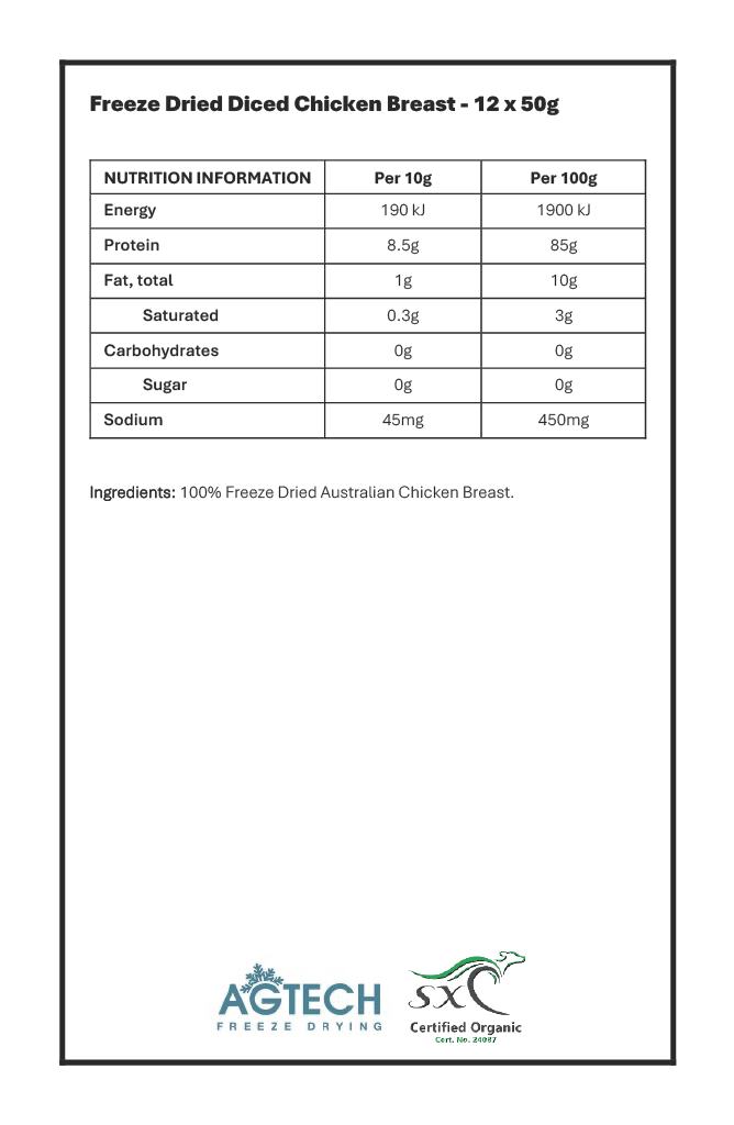 - Ingredients: 100% Australian Chicken Breast (freeze-dried)